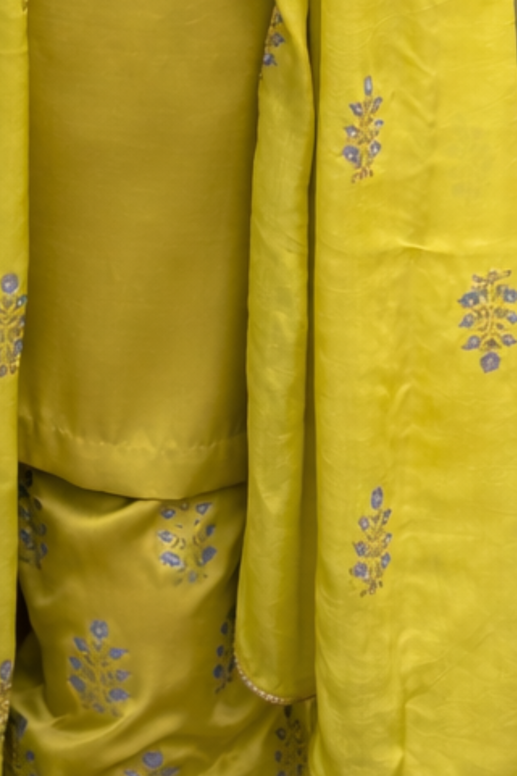 The bright lime green base accented with subtle blue hand-block-printed motifs, creating a fresh and eye-catching look.
