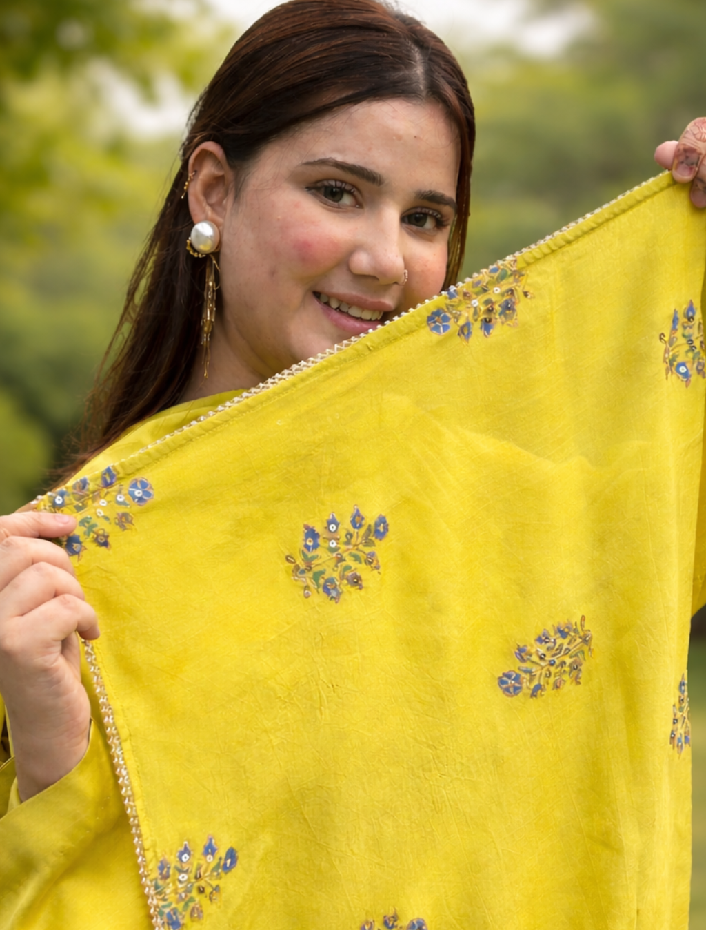 A semi-pure silk dupatta beautifully decorated with hand-block-printed patterns and finished with subtle sequin hand embellishments, adding a refined festive sparkle.