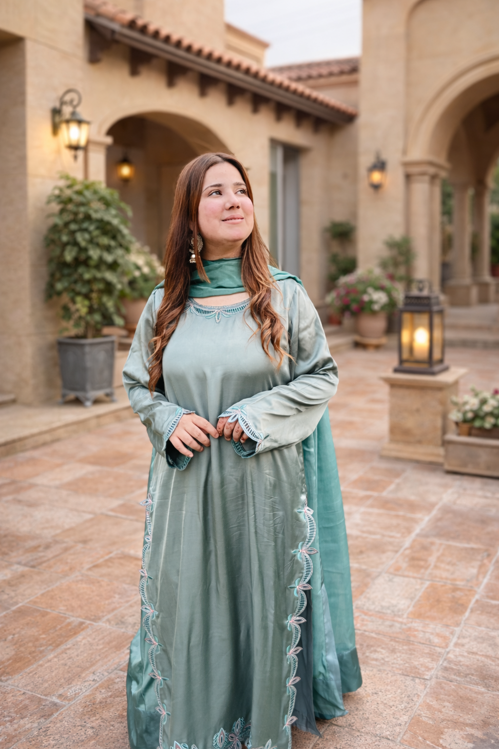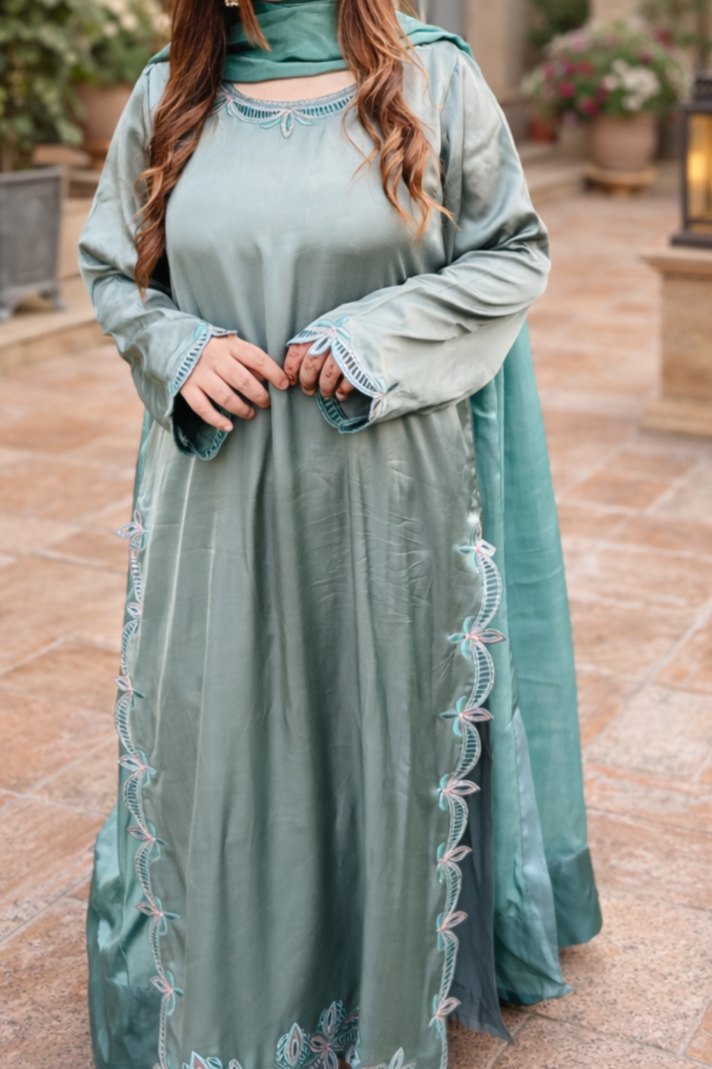 Step into graceful tradition with this elegant silk ensemble, designed for women who appreciate classic craftsmanship and a refined festive look for Eid, family gatherings, and cultural events.