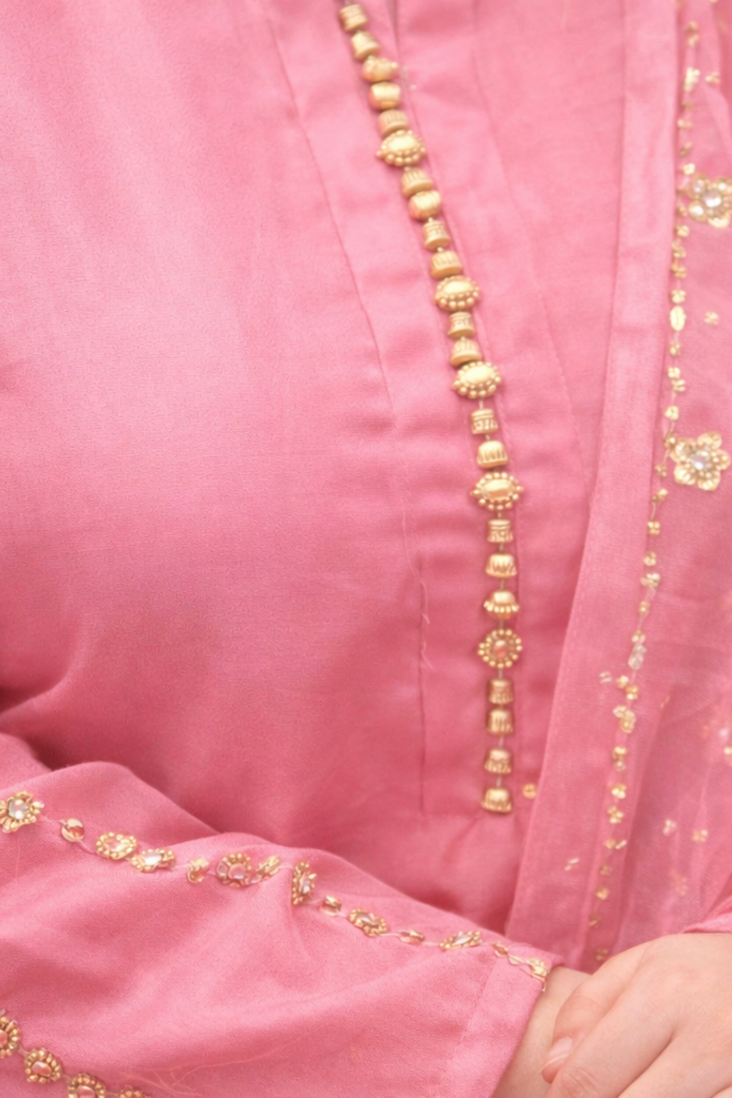 A graceful straight-cut kameez crafted from smooth premium fabric, featuring delicate golden embellishments along the neckline and sleeves. The subtle detailing enhances the soft pink tone, giving the outfit a refined and elegant appearance.